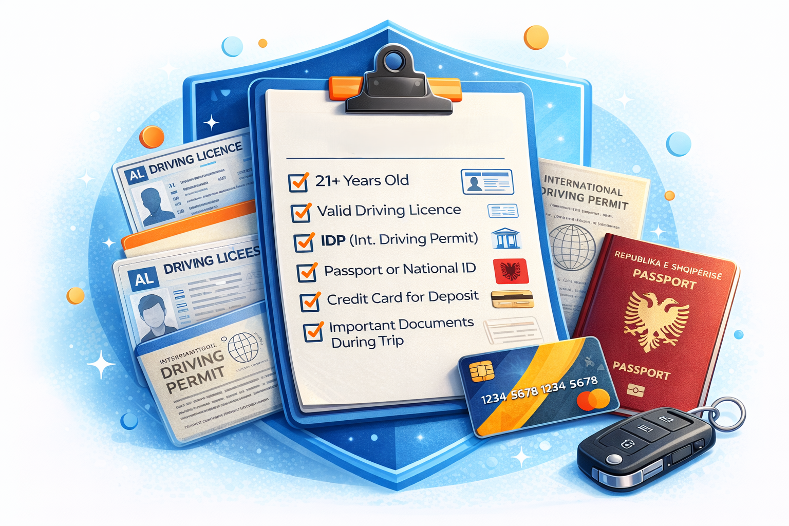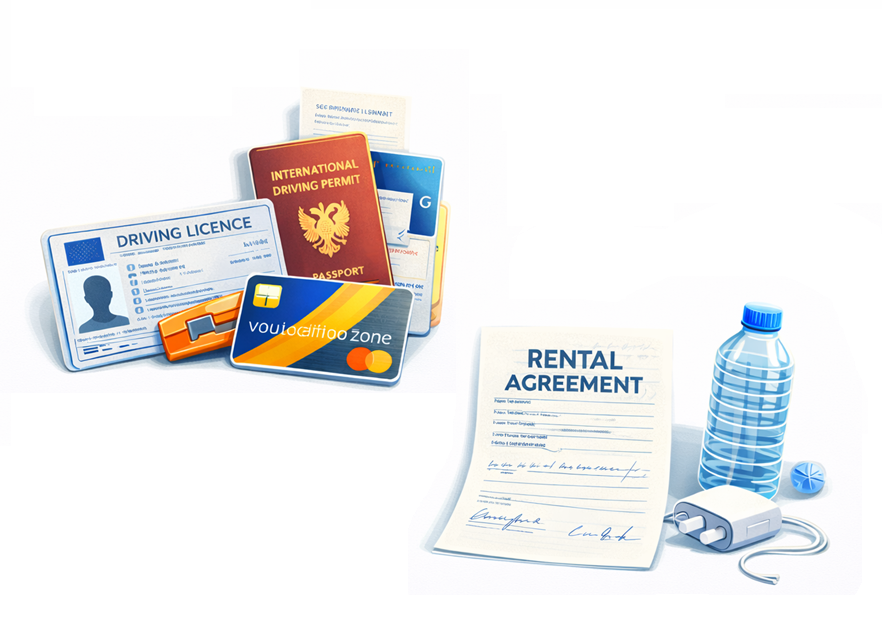 - Driving licence (+ IDP if required), passport/ID, payment card, voucher/confirmation
